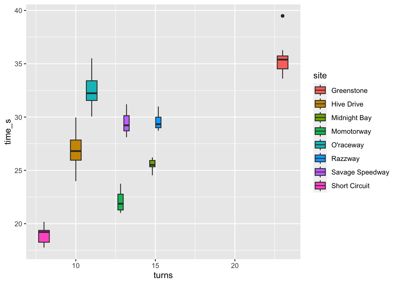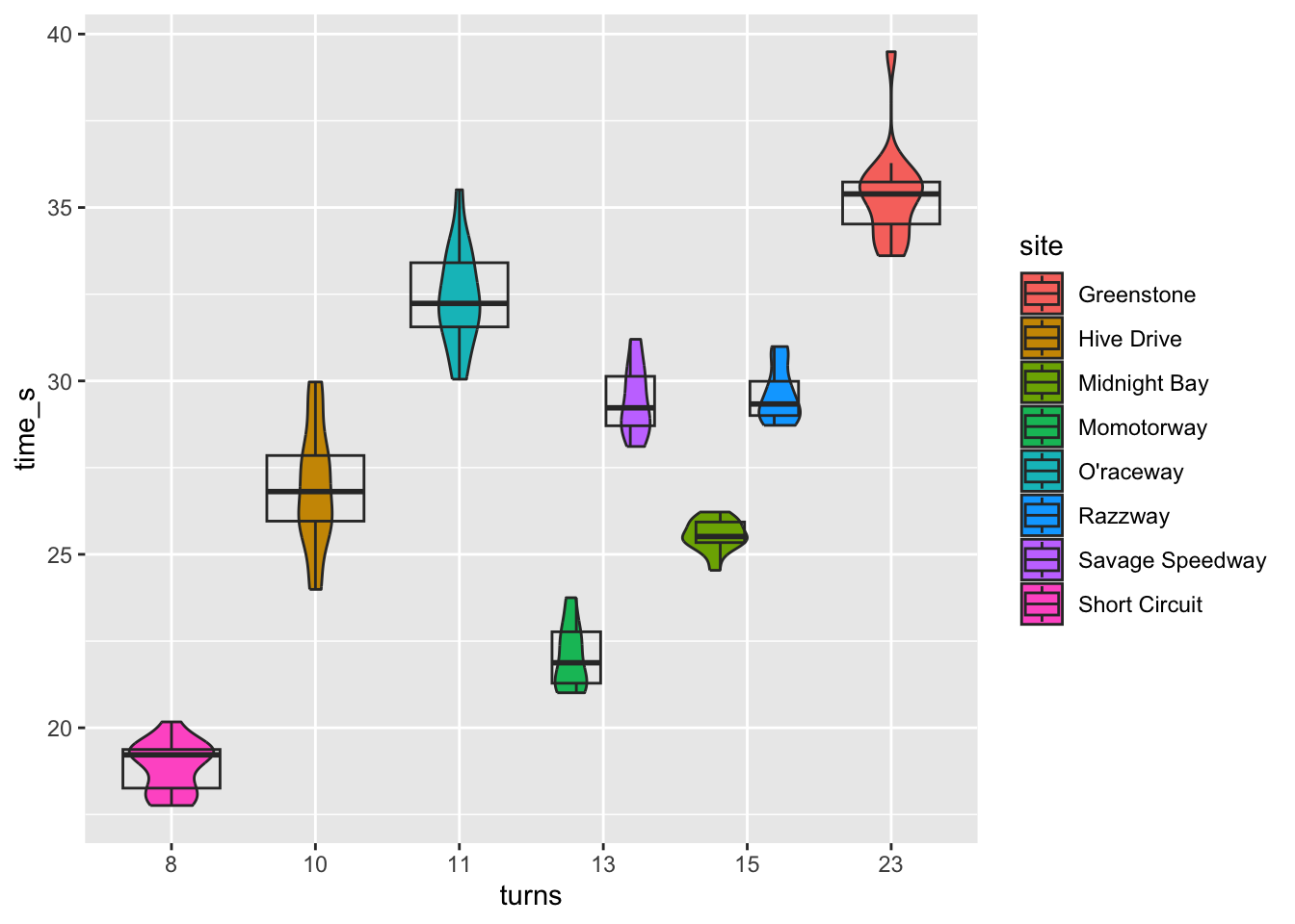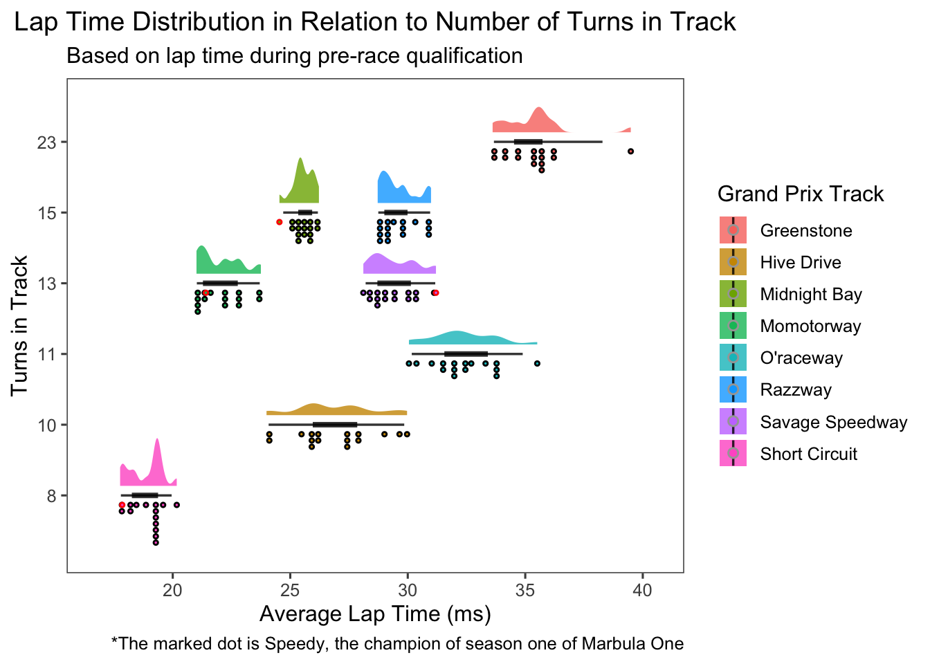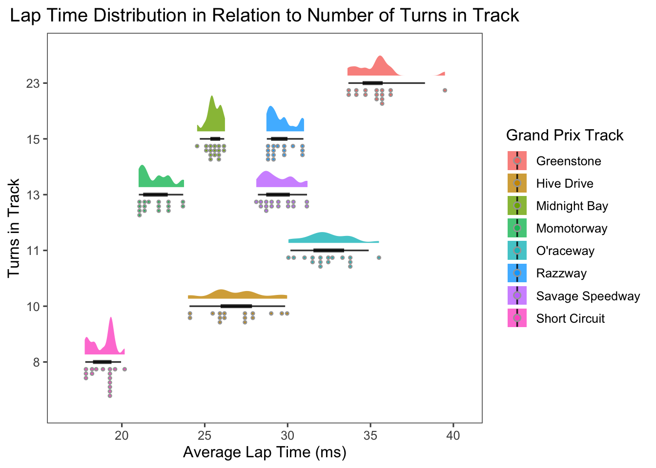 I chose to use a raincloud plot to examine the distribution of lap times on different courses, and how that relates to the number of turns in the course.